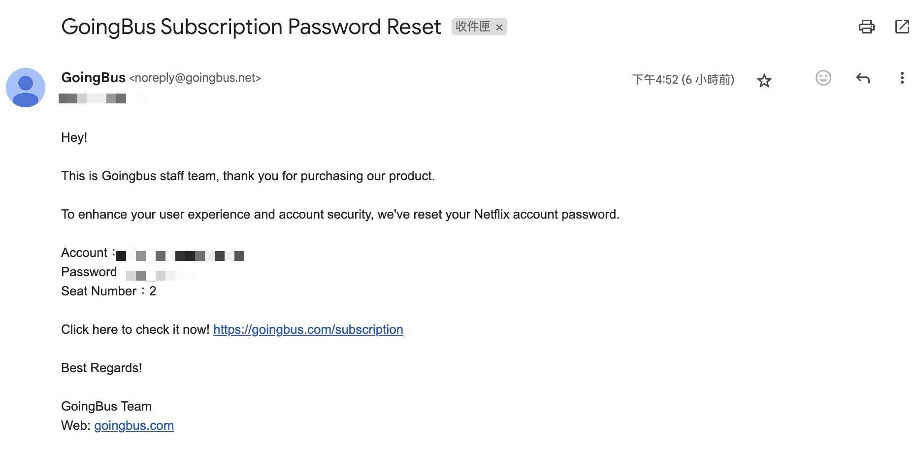 付款成功後,過不久就會收到信件。上面有專屬的帳號密碼,就可以到Netflix登入使用了。