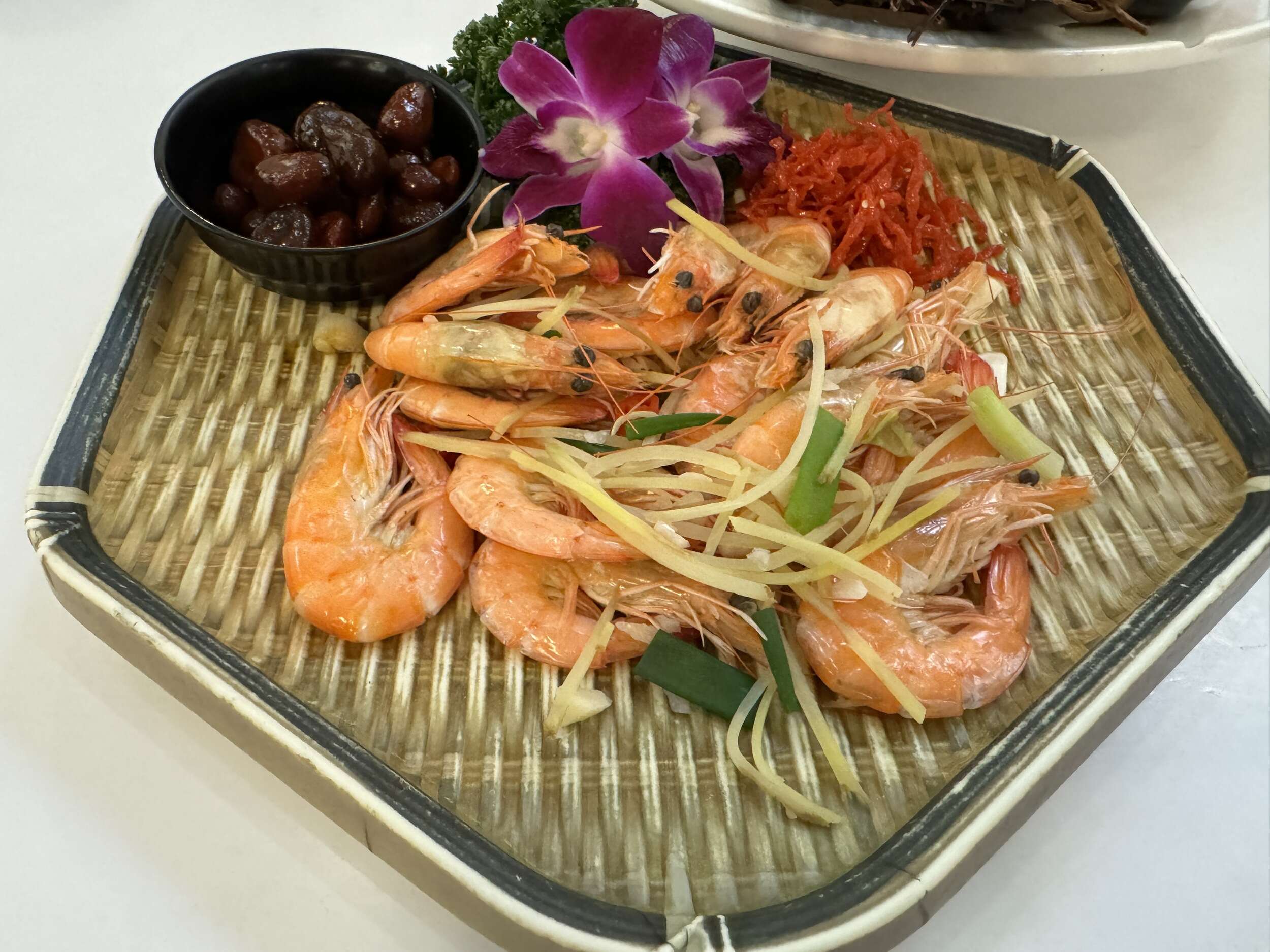 這道鹹水蝦調味保持極為簡單,卻能完全展現白蝦的鮮甜味道,且蝦殼極易剝開,正是其新鮮的最佳證明。特別值得一提的是旁邊的紅蘿蔔蜜餞,這是我第一次嚐到如此類型的蜜餞,酸甜滋味交織,實在是太美味了!