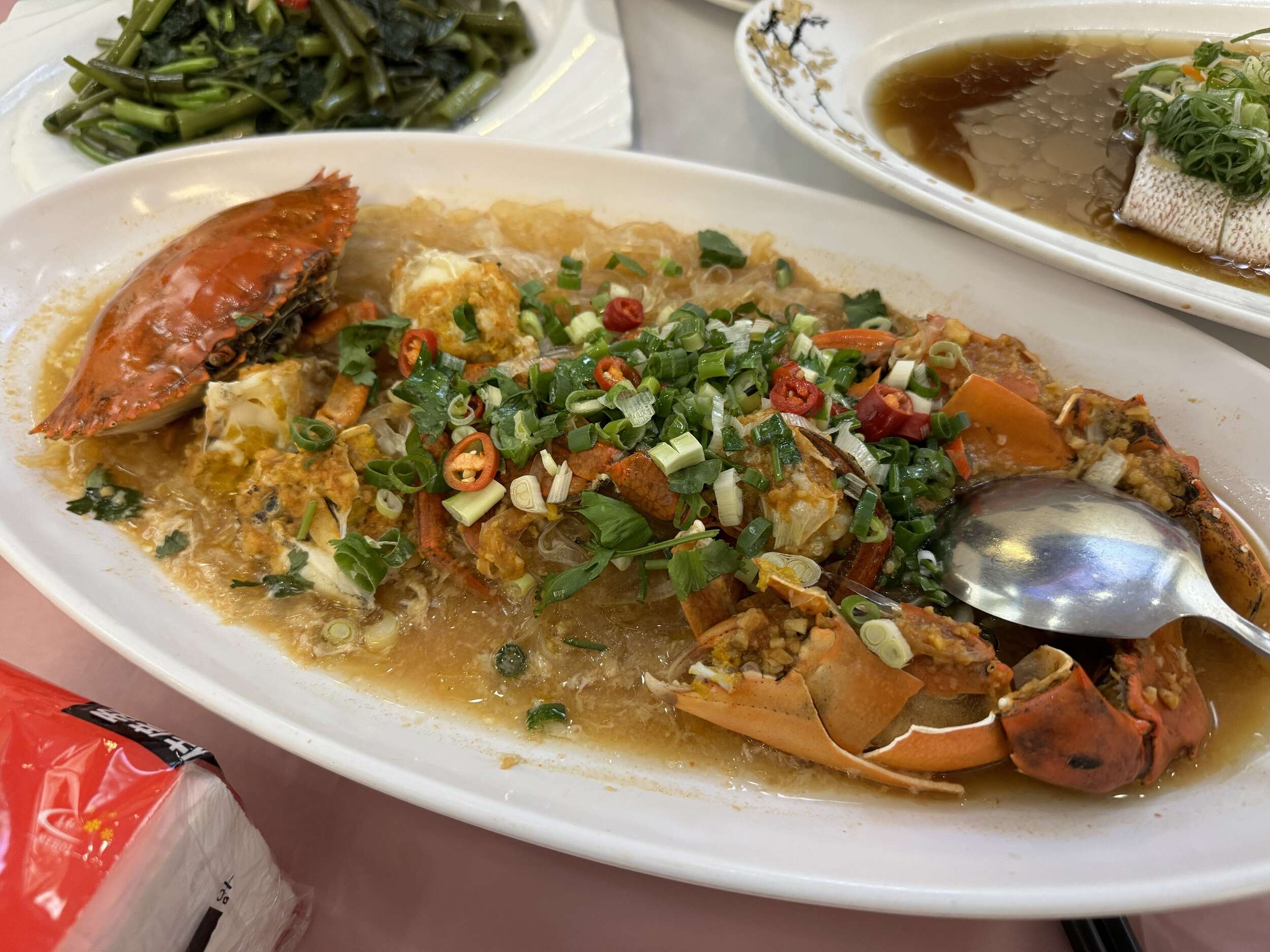 來蟹老闆活海鮮怎能不試試螃蟹呢?這道蒜泥螃蟹裡的粉絲吸滿了湯汁,拌上蔥花和滿滿的蟹膏,口感清甜又美味,讓人忍不住一口接一口把所有粉絲吃光!
