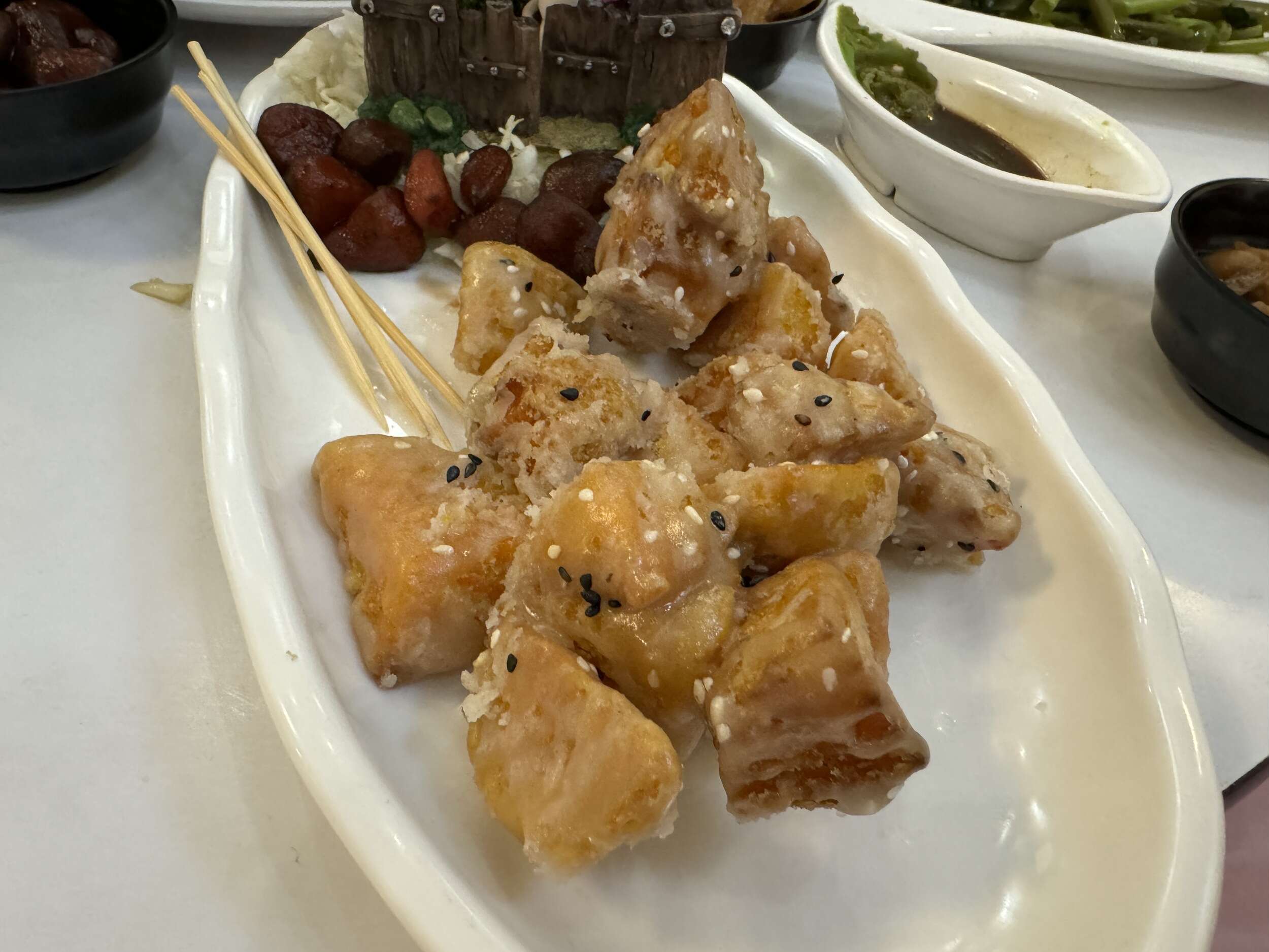 這道料理是主廚的隱藏新菜色,選用優質地瓜切成小塊,裹上精選的麵衣後直接油炸至外酥內軟,再均勻地撒上糖霜。冷卻後的地瓜拔絲口感絕佳,遠超過夜市那些類似糖葫蘆的拔絲地瓜,真的很像在吃糖果!超推!