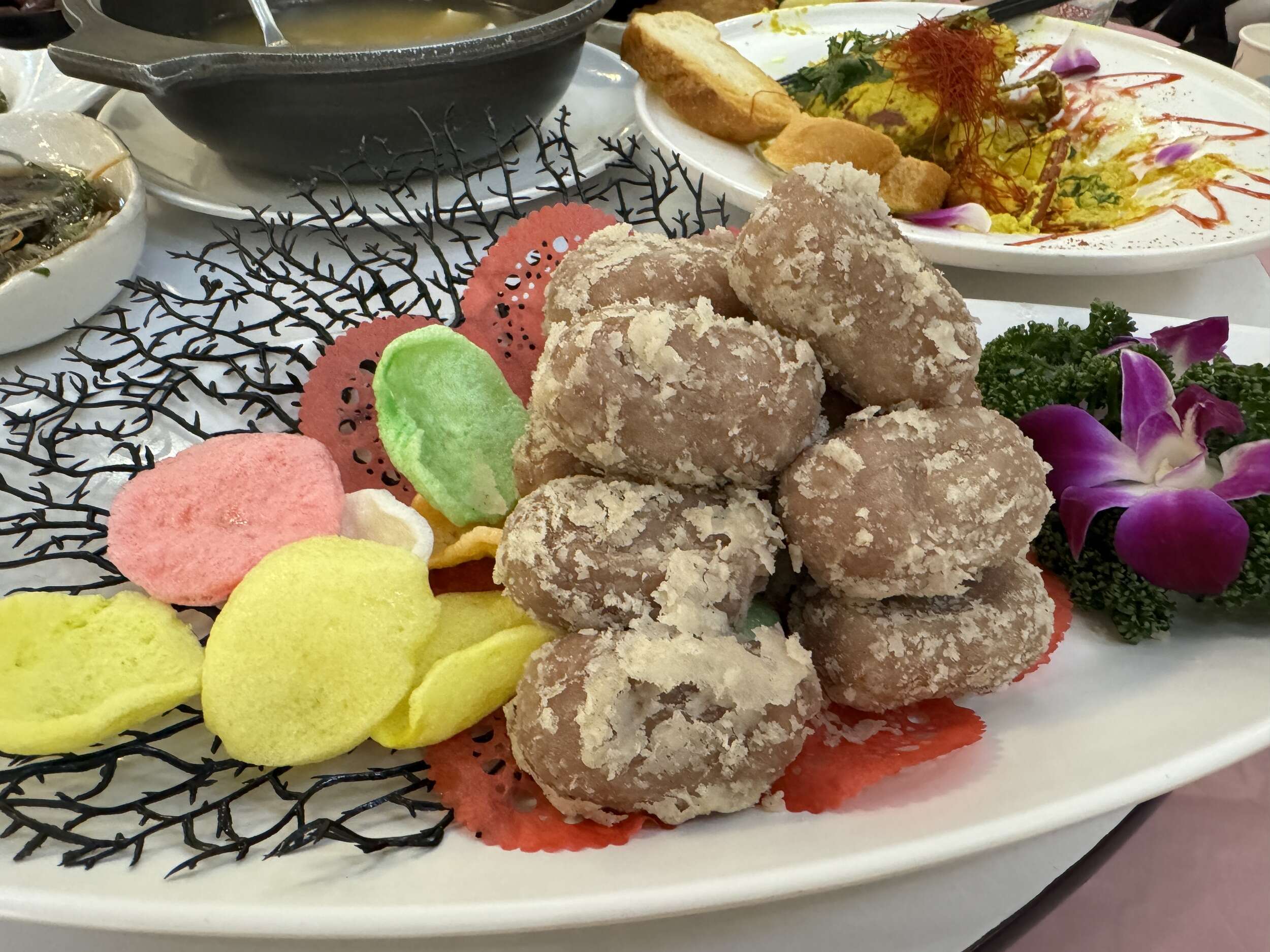 這手工芋香球真的讓我大吃一驚,完全是蟹老闆活海鮮自己製作的餐點,原以為會是那種小小的炸湯圓大小,誰知道竟然和傳統芝麻球一樣大,裡面還藏著滿滿的紅豆餡,外面再裹一層簡單的麵衣一起下鍋炸。吃起來甜而不膩,真的超適合當做飯後甜點。來蟹老闆活海鮮餐廳,這個絕對得點來嘗嘗!!