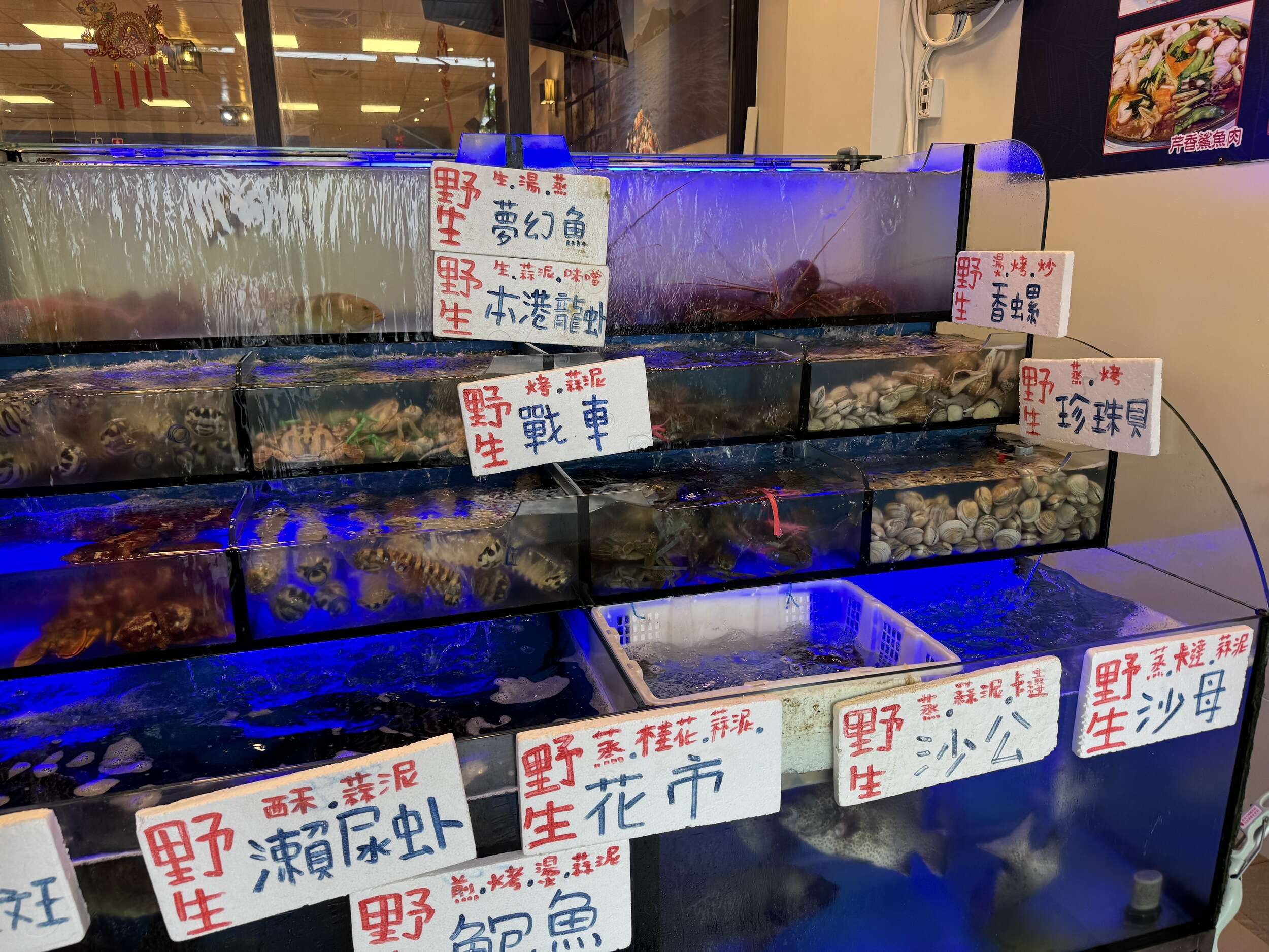 餐廳門口有擺放非常多新鮮海鮮,在這裡可以點一般菜單上的熱炒餐點,或是來這邊挑選自己喜歡的海鮮,每天有的海產都不太一樣,價格也是浮動的,在這邊蟹老闆的服務人員會現場秤重,確定好價格以及烹調方式後,才會進行料理。