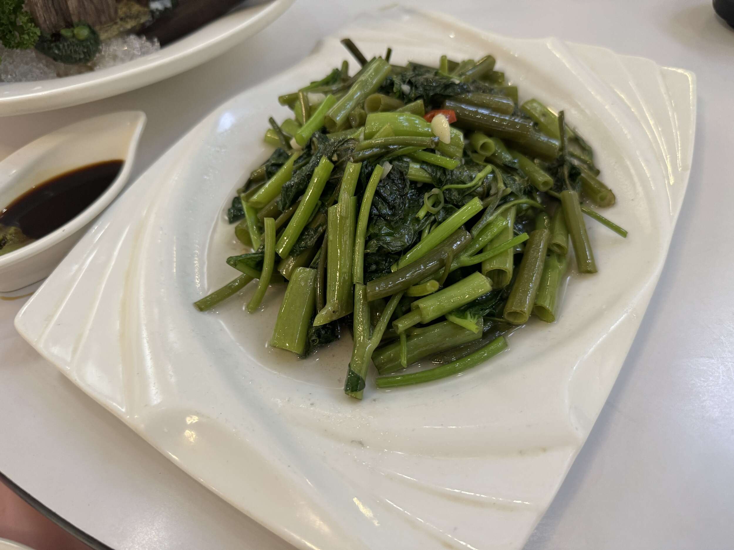 宜蘭特產的空心菜。與台北常見的空心菜相比,宜蘭的空心菜因吸收當地溫泉水的滋養而生長,其莖部粗壯許多,口感更為爽脆。每次來宜蘭,這都是必點的時蔬,新鮮且充滿地方特色!
