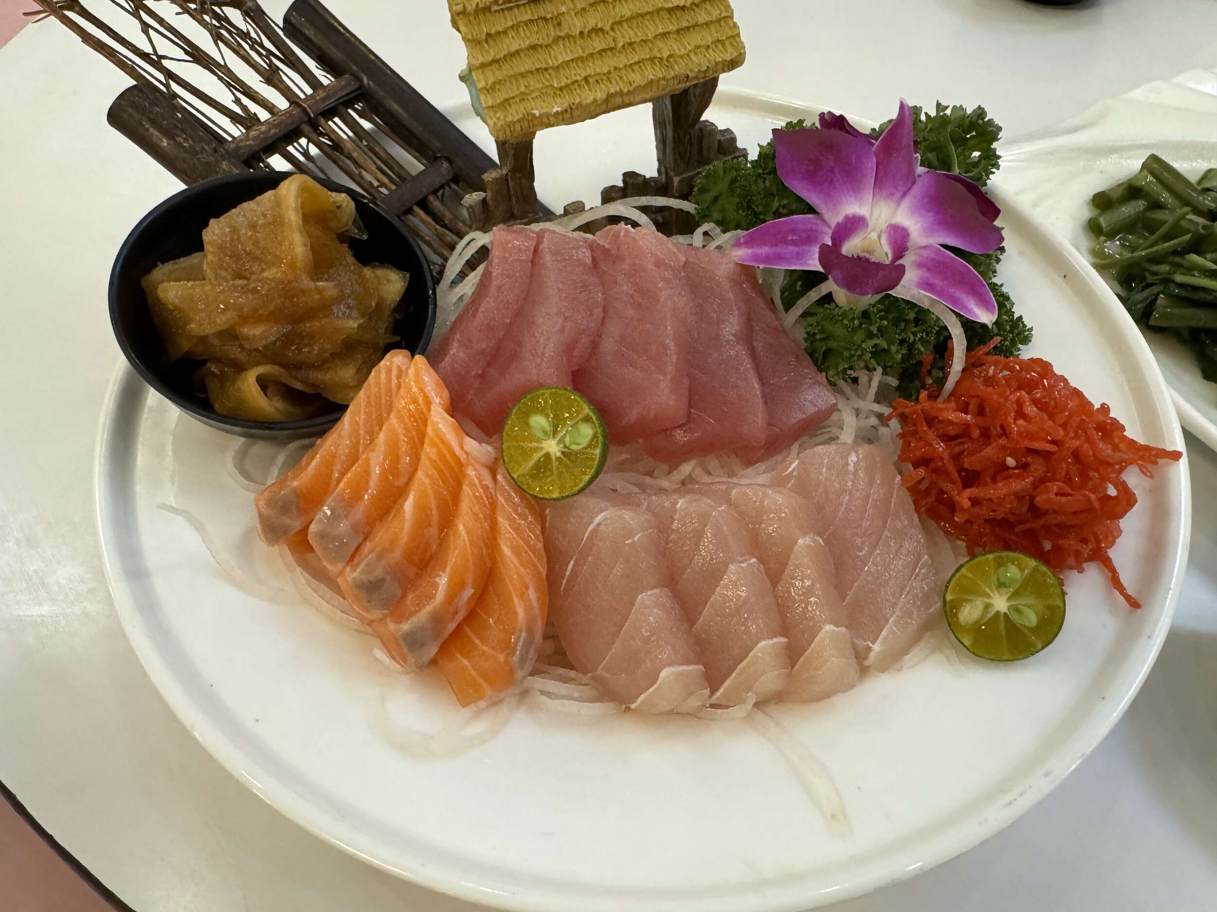 這盤綜合生魚片的新鮮度極高,魚片不僅厚實,且甜度十足。包含了基本的鮪魚、鮭魚及鯛魚,每一片搭配芥末醬油都能讓味蕾感受到極致的享受,入口即化,簡直是人間美味。特別之處在於還配有醃醬菜,增加了整體的風味層次,與生魚片同食相得益彰,絕對是來此必點的佳餚!